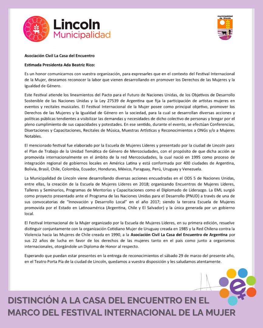 La Casa del Encuentro agradece a la Municipalidad de Lincoln por el reconocimiento otorgado por nuestra labor en la promoción los Derechos de las Mujeres y la Igualdad de Género