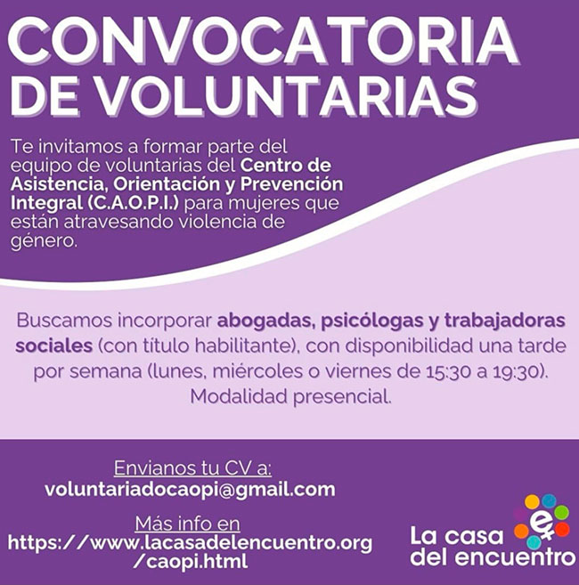 Si sos abogada, psicóloga o trabajadora social, y te interesa formar parte de un equipo de profesionales comprometidas con el abordaje de la violencia de género, envíanos tu CV a: voluntariadocaopi@gmail.com |