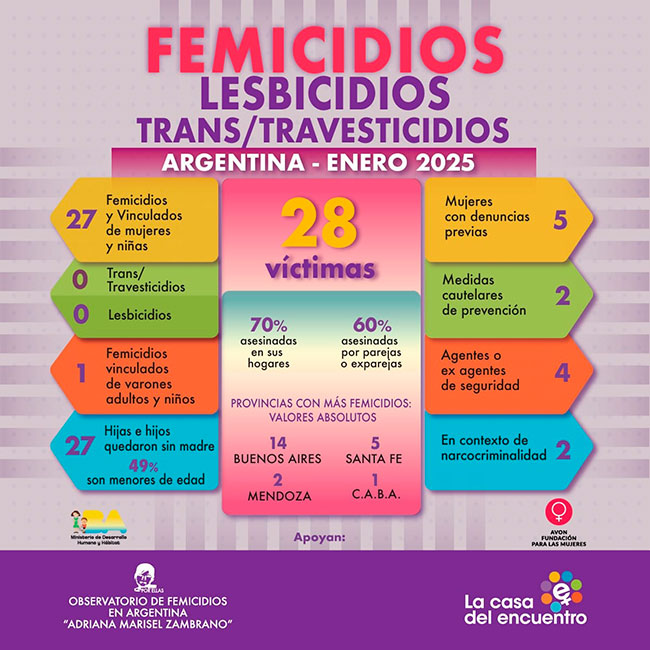 Desde el 1° de enero al 28 de febrero de 2025, se produjeron 55 femicidios y vinculados de mujeres y niñas y 1 femicidio vinculado de un varón adulto, según un nuevo informe del Observatorio de Femicidios en Argentina “Adriana Marisel Zambrano” que dirige La Casa del Encuentro.