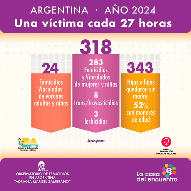 Desde el 1 de enero al 31 de diciembre de 2024, se produjeron 283 femicidios, 3 lesbicidios, 8 trans/travesticidios y 24 femicidios vinculados de varones, según el informe anual del Observatorio de Femicidios en Argentina “Adriana Marisel Zambrano” que dirige La Casa del Encuentro. 343 hijas /hijos quedaron sin madre, el 52% son menores de edad.