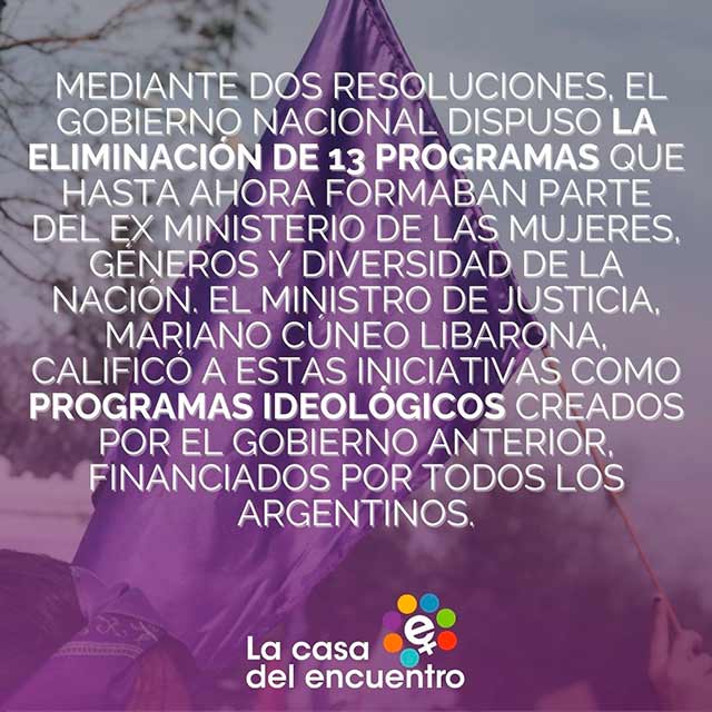En un año de gestión se eliminaron, destruyeron, desfinanciaron, y menospreciaron todo lo relacionado al género y sus políticas. Tanto en lo relativo a la prevención y protección de las violencias como en el reconocimiento de las desigualdades e inequidades que sufren mujeres y diversidades a lo largo de sus vidas.