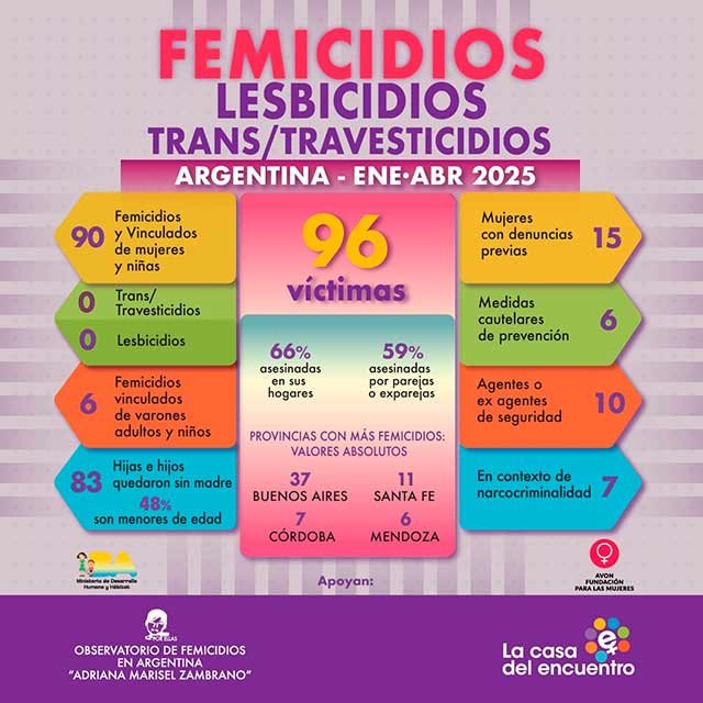 Si bien desde nuestro Observatorio venimos sosteniendo que a lo largo de los años las estadísticas de femicidios se sostienen en sus números, lo que notamos es que la violencia hacia de mujeres y diversidades se acrecienta en contextos adversos como los que estamos atravesando. La negación de su existencia sumado a la eliminación, desmantelamiento y desfinanciación de los espacios estatales que trabajaban en la protección, en la asistencia y en la prevención, inevitablemente pone a mujeres, niñas, niños, adolescentes y diversidades en peligro constante de sufrir cualquiera de las violencias tipificadas en la ley 26.485. Cada día, desde diciembre de 2023, recibimos alguna agresión planificada, ya sea por acción o por omisión, en donde perdemos un derecho, una política pública o un espacio de atención. El Ejecutivo actual ignora la Constitución Nacional, los tratados internacionales firmados y la legislación vigente en todas las áreas. Nada de lo que especifica la ley 26.485 “Ley de Protección Integral para Prevenir, Sancionar y Erradicar la Violencia contra las Mujeres en los ámbitos en que desarrollen sus relaciones interpersonales”, se cumple y esto se agrava cuando sumamos la violencia simbólica que, a través de los discursos de odio, instala que quien se sale de la “norma” es negativo. Los varones violentos que se identifican con estos discursos, se encuentran habilitados desde el Estado para poner en acto esa violencia verbal y pasar al ataque directo como ya ha sucedido en varias oportunidades llegando, en muchos casos, a la violencia más extrema que es el femicidio. Las mujeres estamos en peligro, defendamos nuestro derecho a vivir una vida libre de violencias.