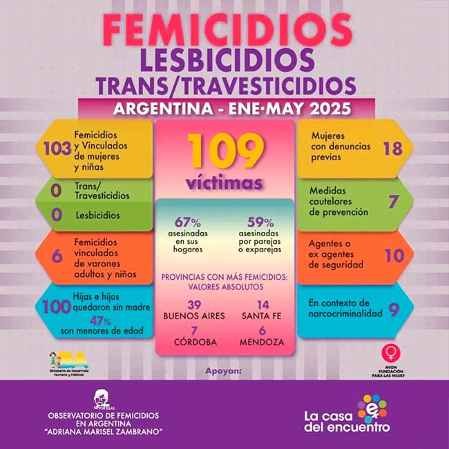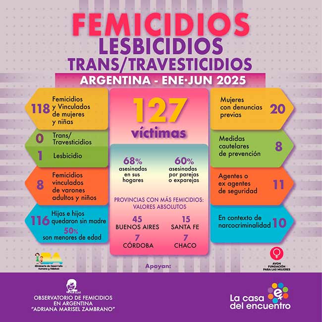 Los datos más relevantes son que 166 hijas/hijos quedaron sin madre, el 52% son menores de edad; el 59% de los agresores eran parejas o exparejas. Como cada informe lo demuestra, el lugar más inseguro para una mujer en situación de violencia continúa siendo su vivienda o la vivienda compartida con el agresor (63% fueron asesinadas en su hogar). Y si bien los femicidios abarcan el territorio nacional, en términos absolutos Buenos Aires sigue siendo la provincia con más casos, seguida por Santa Fe, Córdoba y Chaco.