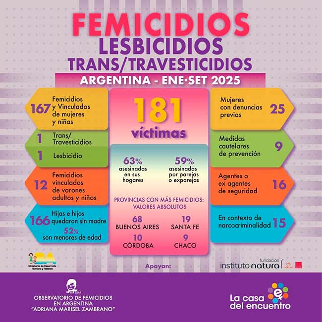 Desde el 1° de enero al 30 de septiembre de 2025, se produjeron 167 femicidios y vinculados de mujeres y niñas, 1 lesbicidio, 1 transfemicidio y 12 femicidios vinculados de varones adultos y niños, según un nuevo informe del Observatorio de Femicidios en Argentina “Adriana Marisel Zambrano” que dirige La Casa del Encuentro.