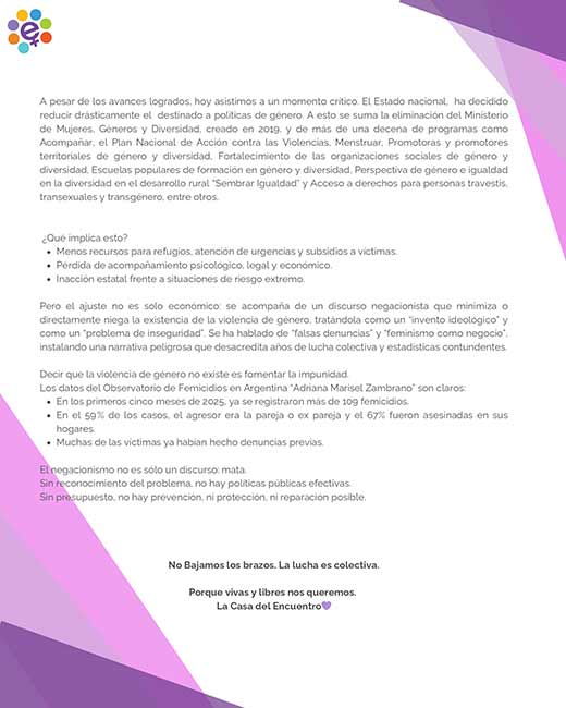 ⚠️ Desde la Casa del Encuentro reafirmamos el compromiso de seguir trabajando para desnaturalizar la violencia de género, acompañar a las víctimas y exigir una transformación cultural profunda que garantice una vida libre de violencias para todas.