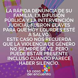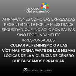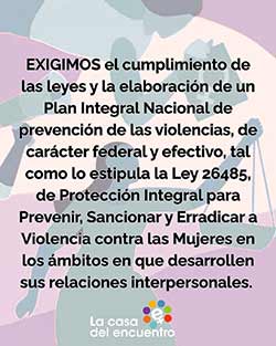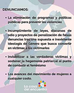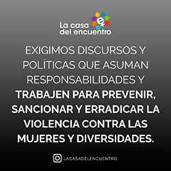 La Casa del Encuentro trabaja para erradicar las violencias y exige, mes tras mes junto con este informe, que se tome conciencia de la gravedad de la situación actual: ausencia de un organismo rector, negación de la problemática de género y aumento de las distintas violencias, especialmente la simbólica que habilita los discursos de odio que muchas veces se ponen peligrosamente en acto, entre otras cosas.