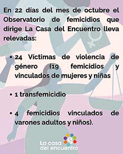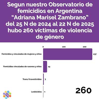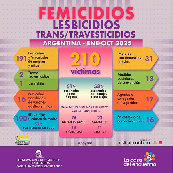 Desde el 1° de enero al 31 de octubre de 2025, se produjeron 191 femicidios y vinculados de mujeres y niñas, 1 lesbicidio, 2 transfemicidios y 16 femicidios vinculados de varones adultos y niños, según un nuevo informe del Observatorio de Femicidios en Argentina “Adriana Marisel Zambrano” que dirige La Casa del Encuentro.