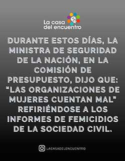 Las organizaciones no contamos mal, le contestamos a la Ministra de Seguridad ante su declaración sobre el descenso en el índice de femicidios en la que afirmó que “las organizaciones de mujeres cuentan mal”. Para nosotras no son solo números. Duelamos a cada víctima, apoyamos a sus familias, hijas e hijos, y entornos cercanos. Somos las voces de cada una de ellas. Hablemos de violencia de género porque lo que no se nombra no existe.