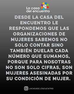 La Casa del Encuentro – fundada en octubre del 2003- releva los casos de femicidios desde el año 2008 y durante muchos años fue el único Observatorio que brindaba estadísticas sobre los asesinatos de mujeres, niñas y diversidades en todo el país que fueron utilizadas para elaborar políticas públicas y leyes de prevención y protección a mujeres y diversidades.