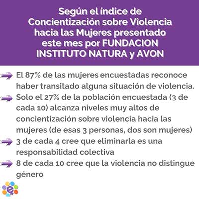 El Índice de Concientización de Violencia contra las mujeres realizado por Fundación Instituto Natura y Avon, mostró que el 87% de las mujeres encuestadas atravesó alguna forma de violencia, pero el 32% no la reconoce espontáneamente como tal.