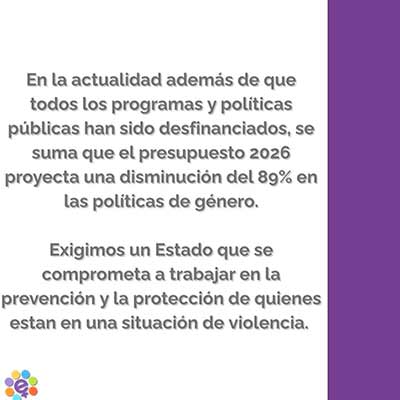 Desde nuestra asociación civil nuestra tarea es hoy más importante que nunca. Tanto desde el monitoreo al Estado en el cumplimiento de sus deberes, como en la atención a quienes se encuentran en una situación de violencia que se incrementa ante un estado que desaparece. Nuestras mujeres, niñas, niños, adolescentes y diversidades necesitan que se garantice la efectiva implementación de políticas públicas contra la violencia de género, profundizando las campañas de prevención /asistencia continuando con el respeto por leyes, tratados internacionales y programas existentes.