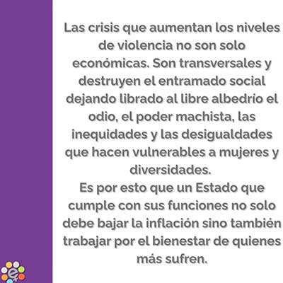 Durante enero hubo un femicidio cada 26 horas, esto es lo que desde el ejecutivo llaman “joda”. Familias destruidas, hijos e hijas sin madre, pero fundamentalmente, vidas de mujeres y diversidades que han quedado truncas por el poder que les da a los hombres violentos el sistema patriarcal hoy avalado por este gobierno. Eliminar este agravante, no brinda igualdad ante la ley, sino que desconoce la problemática social del femicidio y vulnera aún más el derecho de las mujeres, niñas, adolescentes y diversidades a una vida libre de violencias por razones de género. O sea, eso es desigualdad: negar la realidad, tergiversar conceptos, propiciar discursos de odio y ensuciar el trabajo de quienes visibilizamos la problemática a diario, entre tantas otras agresiones verbales vertidas desde que asumieron la conducción del país.