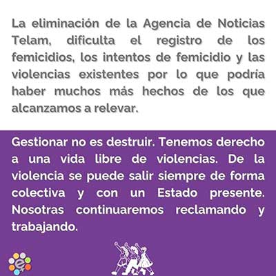 Contrariamente a lo dicho desde el gobierno las cifras se mantienen año tras año. En cada informe tratamos de entender cuál es el camino para erradicar la violencia de género recordando que es multicausal, ligada a las diferentes situaciones en las que se encuentran quienes la atraviesan y es por eso que su abordaje debe ser integral, multidisciplinario y federal. Sin embargo, desde diciembre del año pasado nos enfrentamos a un ejecutivo que descree de su existencia y por lo tanto ha desmantelado y eliminado, prácticamente, todo lo relativo al género y sus violencias. Hace 12 meses que denunciamos esta situación sin respuestas y aunque la justicia obligue al gobierno a continuar con las políticas de prevención y protección este insiste -mediante el recurso de apelación- en no ocuparse de esta problemática.