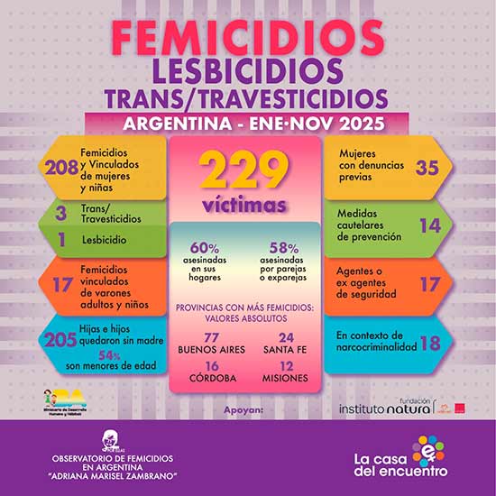 Desde el 1° de enero al 30 de noviembre de 2025, se produjeron 208 femicidios y vinculados de mujeres y niñas, 1 lesbicidio, 3 transfemicidios y 17 femicidios vinculados de varones adultos y niños, según un nuevo informe del Observatorio de Femicidios en Argentina “Adriana Marisel Zambrano” que dirige La Casa del Encuentro.